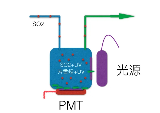 相信这张SO2原理图大家都能看懂,UV+So2---荧光,而芳香烃跟SO2有着同样的特性,芳香烃+UV---荧光,这就造成了PMT信号增强。