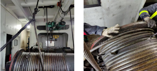 第五步:将旧钢丝绳连着牵引绳一直放到地面上,拆除旧绳,将牵引绳与新钢丝绳对接,利用电机滚筒将新绳往上拉,直至牵引绳全部从滚筒上脱出。