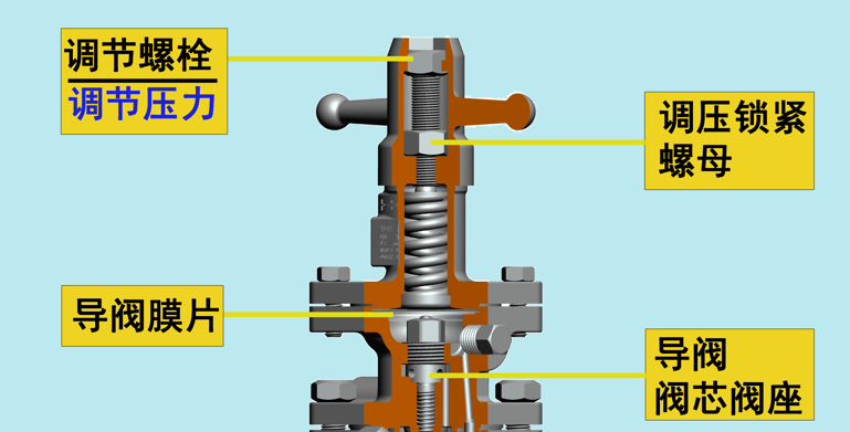是通过感应管感应下游压力,流过先导阀的蒸汽,是由调节弹簧和二次反馈压力之间的平衡来控制。
