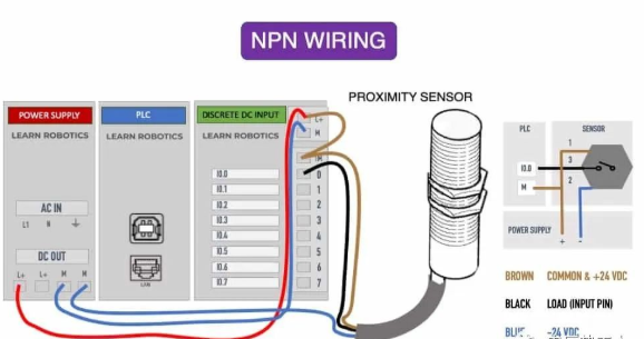 首先,将棕色线或 1 号线连接到 +24 V。然后将 2 号线(蓝色线)连接到电源的公共端子。最后,将黑线或 Wire 3 连接到 PLC 输入卡上的负载或引脚。