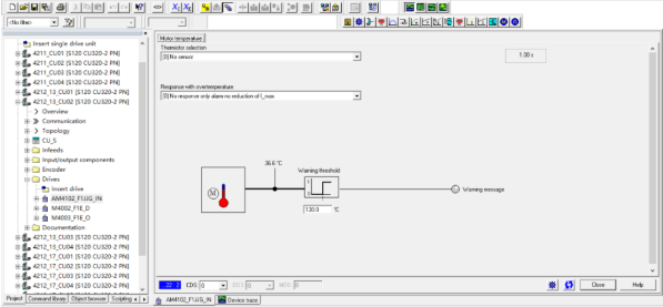 精轧F1入口机架辊是没有测温元件的,P0600=0(无测温元件),P610=12(报警,不降低最大电流,保存温度);当r35实际电机温度超过130度(参数P604)触发电机超温报警,超过145度(参数P605)触发F07011电机超温故障;