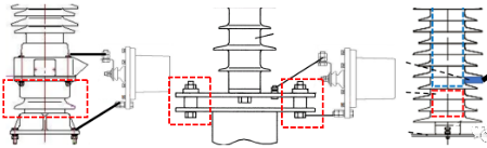 b.绝缘螺栓形式。该类避雷器为复合绝缘护套避雷器常用的结构形式,这种避雷器重量轻,避雷器本体一体性好,但是零部件多,地脚螺栓外绝缘护套在长期运行下存在绝缘开裂的情况,后期运行中出线问题需要对零部件进行更换。