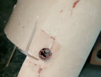 (3)C相避雷器解体分析:对C相避雷器解体发现,底座垫块有一条明显线形放电通道,在导电杆相应位置有放电点,底座垫块靠近下电极引出线处有一处带状发热痕迹,并在导电杆相应位置有生锈痕迹,如图6所示。