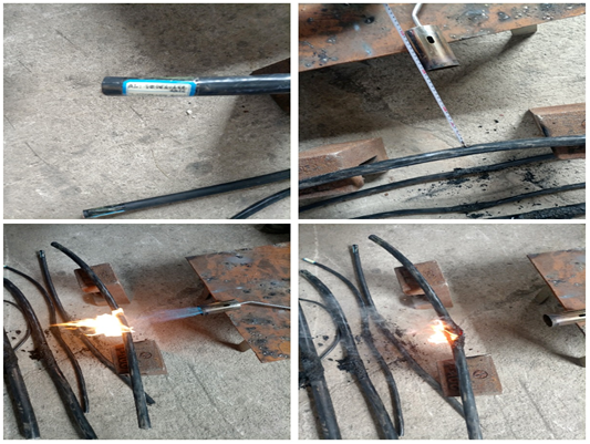 4.将煤气罐火焰移动到电缆中心位置,调整火焰高度,使蓝色内焰锥火焰与样品的表面距离为200mm,开始计时,时限60S(供火时间);