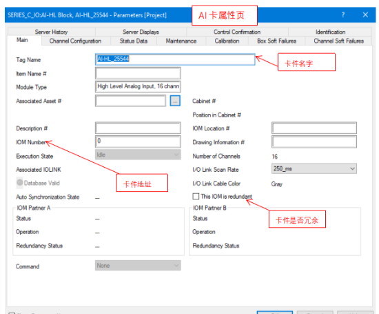 在Project窗口的任意一处鼠标右键点击,依次选择New-->I/O Modules-->SERIES_C_IO-->AI-HL- High Level Analog Input, 16 channels。或者从Library库中选择SERIES_C_IO展开,拖拽AI-HL到IOLINK中。出现AI卡配置页面,如图: