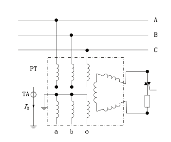 PT——电磁式电压互感器;R——阻尼电阻;K——阻尼电阻投切开关;TA——电流互感器:Uo—零序电压;I0——零序电流。