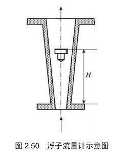 转子流量计又名浮子流量计或面积流量计。浮子流量计具有结构简单,使用维护方便,对仪表前后直管段长度要求不高,压力损失小且恒定,测量范围比较宽,工作可靠且线性刻度,可测气体、蒸汽和液体的流量,适用性广等特点。浮子流量计主要由一根自下向上扩大的垂直锥管和一只可以沿着锥管的轴向自由移动的浮子组成,如图 2.50 所示。当被测流体自锥管下端流入流量计时,由于流体的作用,浮子上下端面产生一差压,该差压即为浮子的上升力。当差压值大于浸在流体中浮子的重量时,浮子开始上升。随着浮子的上升,浮子最大外径与锥管之间的环形面积逐渐增大,流体的流速则相应下降,作用在浮子上的上升力逐渐减小,直至上升力等于浸在流体中的浮子的重量时,浮子便稳定在某一高度上。这时浮子在锥管中的高度与所通过的流量有对应的关系。
