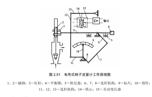上面所介绍的转子流量计只适用于就地指示,对配有电远传装置的转子流量计,可以将反映流量大小的转子高度 h 转换为电信号,传送到其他仪表进行指示、记录和控制。图2.51 为电传式转子流量计的工作原理图。当流体流量变化时使转子转动,磁钢 1 和 2 通过带动杠杆 3 及连杆机构 6 、 7 、 8 使指针 10 在标尺 9 上就地指示流量。与此同时,差动变压器检测出转子的位移,产生差动电势通过放大和转换后输出电信号,通过显示仪表显示和通过控制仪表进行调节。