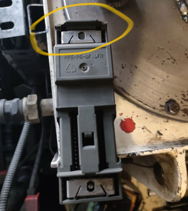 确定两台高压泵都正常运行后,开始对PLC故障进行处理,我们断开PLC电源,断电后DI通道灯没有变化,原来亮的依然亮。拆除CPU模块,将存储卡重新插拔一次,回装上电后,故障灯消失,几个DO通道也正常输出,但不到一分钟,再次报SF故障。于是,我们将备用的CPU模块换上,故障依旧。我们在轻微晃动IO卡件时发现,第一块DO卡,晃动时SF故障灯消失,检查发现,由于使用年久(模块为135底渣所用PLC模块)至今已20年左右。模块塑料外壳的两个卡扣都已断裂,导致接触不好,型号为:6E7 322-1BH01-0AA0。下图为老化断裂的卡扣。