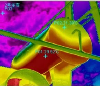 上图为变压器套管末屏发热的情况。变压器套管末屏在安装时如果没有安装到位,会在运行中放电、发热,如果长时间不处理可能会造成事故。但运行中的变压器不方便进行实际设备的检查,而红外测温可以有效进行识别。