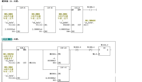 2 .在高炉上升管道接入防堵头取压管及PDS压力变送器,得到第二个顶压,在高炉本体PLC上加入比较程序,两个压力相差4KPa报警,提示需要维护。断线自动投入另一顶压,在高于6KPa时自动投入顶压高的信号。